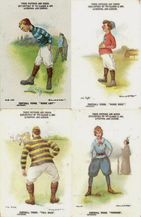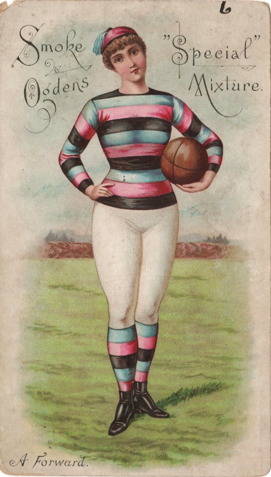 If you hunt, you will find lady footballers on vintage cigarette cards and postcards. Some time between 1895 and 1900, Ogden's issued twelve cards which have come to be known as "Cricket and Football Terms - Women" (O/2-14 : RB.15/69 : RB.21/170.1 : H.314) And do note that some of these cards are actually rugby football. These cards were what is known as standard size, 67 x 36 m/m, and were un-numbered. In our original Reference Book RB15 it is stated that the backs are in black with "Ogden's Gold Medal Cigarettes" to the top and a list of seven brands below. However by 1956, for our World Tobacco Issues Index, it had been discovered that there were two other versions.