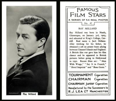 Here we have Ray Milland himself. The back of the card tells us that he was "..born in Neath, Glamorgan, on January 3rd 1905". It also adds that he was "..educated at King`s College Cardiff". Then it says that his "real name is Jack Millane". Have never heard this one before - does it appear on any other cards?