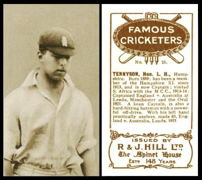 1923. 40 FAMOUS CRICKETERS (titled series). Size 2 3/4" x 1 1/2". Numbered 1-40. Fronts, printed by photogravure, one colour only, no titles or margins. Backs printed in dull brown with crossed bats design : descriptions and "Issued by R. & J. Hill Ltd., The Spinet House..." at base. No address. Printed by Ripley & Co., London.