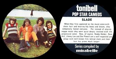 Tonibell Ltd. (Ice cream). “Pop Star Cameos”. 24 to the series. I have not yet seen these cards but W. Titchmarsh reports that the cards are circular and unnumbered. Titled and described on the back and distributed from ice cream vans that tour the district.